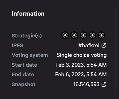 If you don’t understand why your voting power is 0 or how the strategies work in detail, we recommend reaching out to the organization directly. In most cases you don’t have the voting power because you did not hold the required tokens at the time of proposal creation. Tokens which were acquired after the proposal has been created are not taken into account for the voting power calculation.