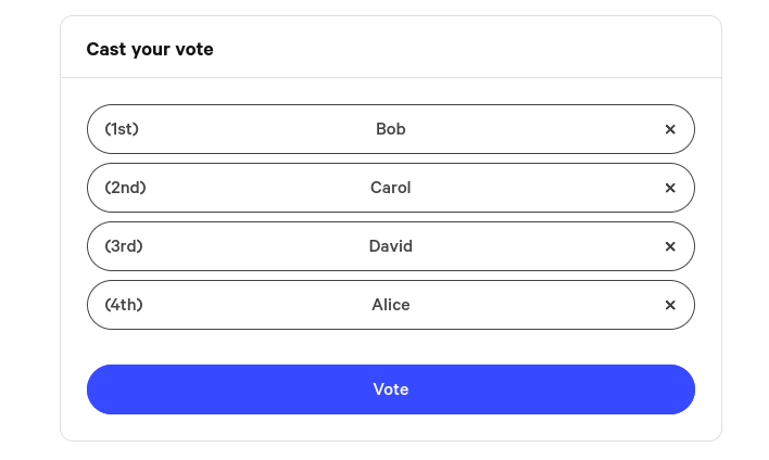 * Rank the different choices in their **order of preference** - [#ranked-choice-voting-instant-runoff-voting](#ranked-choice-voting-instant-runoff-voting "mention")