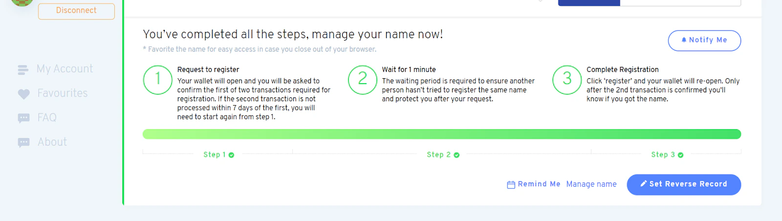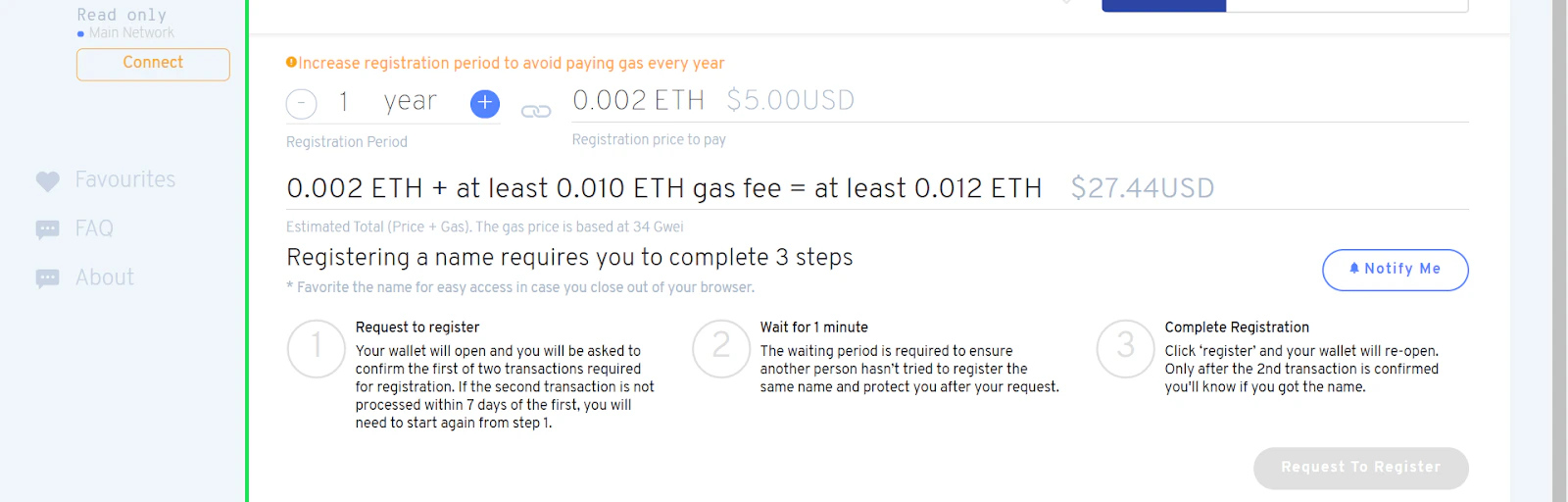 2. If the name is available you will be able to see the 3 steps and the registration fee. Please note that the names with 3 or 4 characters cost considerably more than the names with 5+ characters.