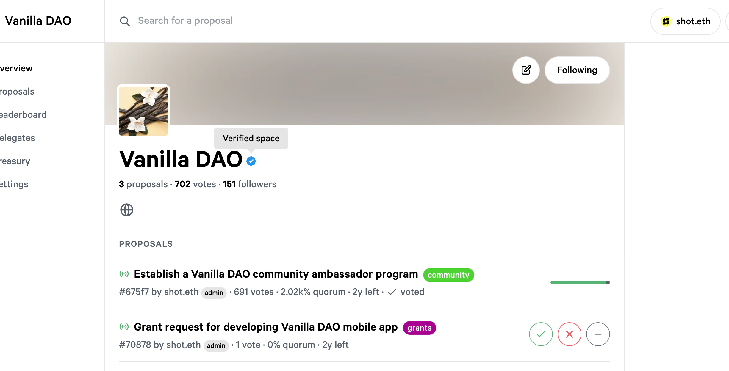 - Ownership verification through an official website, GitHub organization, or a tweet linking to the Snapshot space