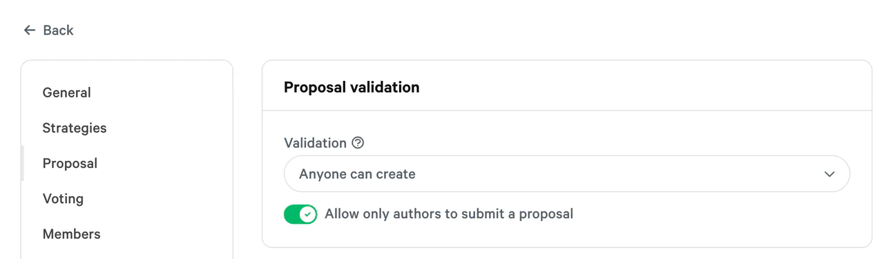 It is also possible to whitelist accounts which will be allowed to create new proposals regardless of the chosen Validation Strategy (more on the strategies in the next section).