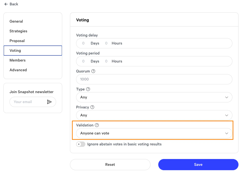 When setting the Validation Strategy up it’s important to keep in mind that it is meant to make it difficult for users outside of your community to post scam proposals or post spam votes.