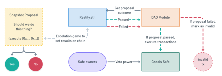 Reality.ethshould resolve to the same outcome, and after a 24 hour cooldown period, the proposal’s transactions are executable by anyone.Reality uses an ERC-20 token (a given DAO’s governance token) for the bond. The minimum bond can be set by way of a proposal to the DAO.